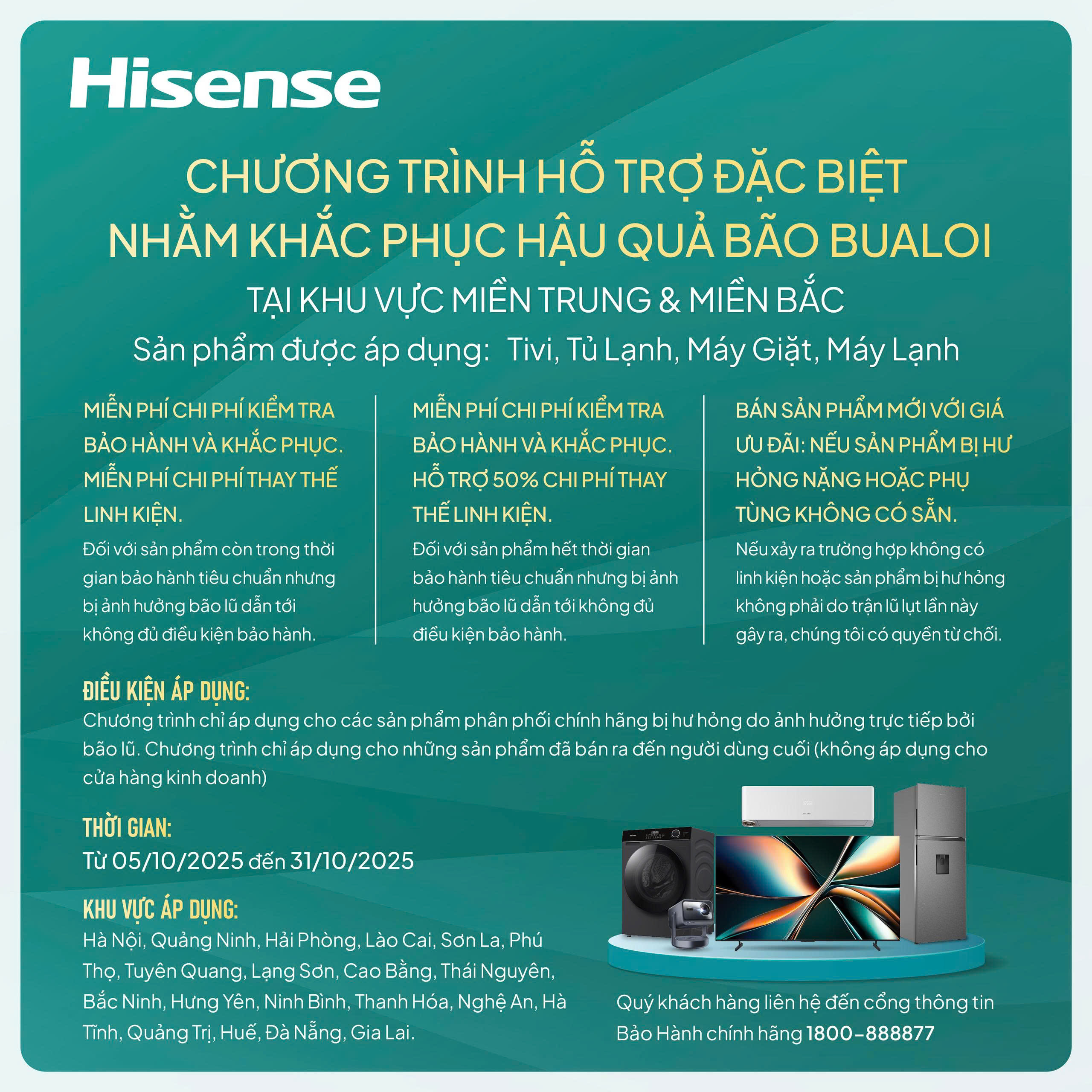 Với tinh thần “Đồng hành cùng người Việt – Vững vàng vượt khó”, Hisense Việt Nam chính thức triển khai Chương trình Hỗ trợ Đặc biệt sau bão Bualoi dành cho khách hàng tại các khu vực chịu thiệt hại trực tiếp.