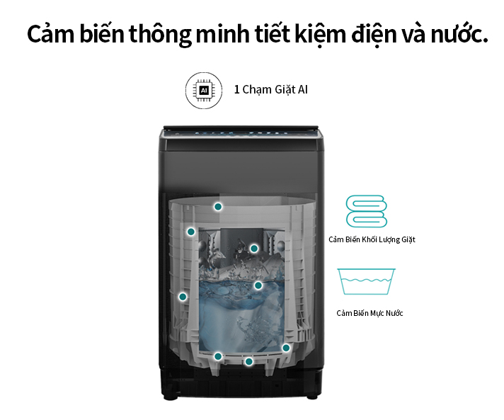 • 1 chạm giặt AI tiết kiệm điện, nước hiệu quả