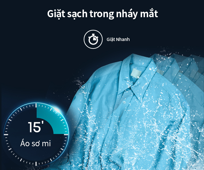 Trong trạng thái tắt nguồn, chỉ cần nhấn và giữ nút “Bắt đầu” trong 3 giây để bắt đầu chương trình Giặt AI. Máy giặt sẽ tự động cài đặt mực nước và thời gian giặt phù hợp với khối lượng quần áo, giúp việc giặt giũ trở nên dễ dàng hơn.