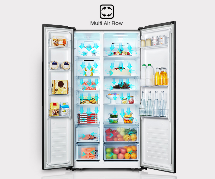 Chức năng làm lạnh đa chiều Multi-Air Flow làm mát tủ lạnh đồng đều từ góc này sang góc khác. Không khí lạnh được luân chuyển qua các lỗ thông hơi ở mọi tầng kệ, vì vậy tủ lạnh duy trì nhiệt độ ổn định và thực phẩm luôn tươi ngon.