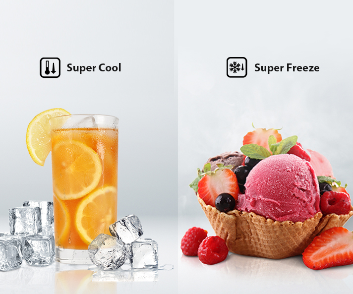 Tính năng Super Cool nhanh chóng giảm nhiệt độ bên trong tủ lạnh xuống +2℃ trong 6 giờ. Đây là cách tuyệt vời giúp giữ nguyên hương vị, màu sắc và giá trị dinh dưỡng của thực phẩm tươi sống.