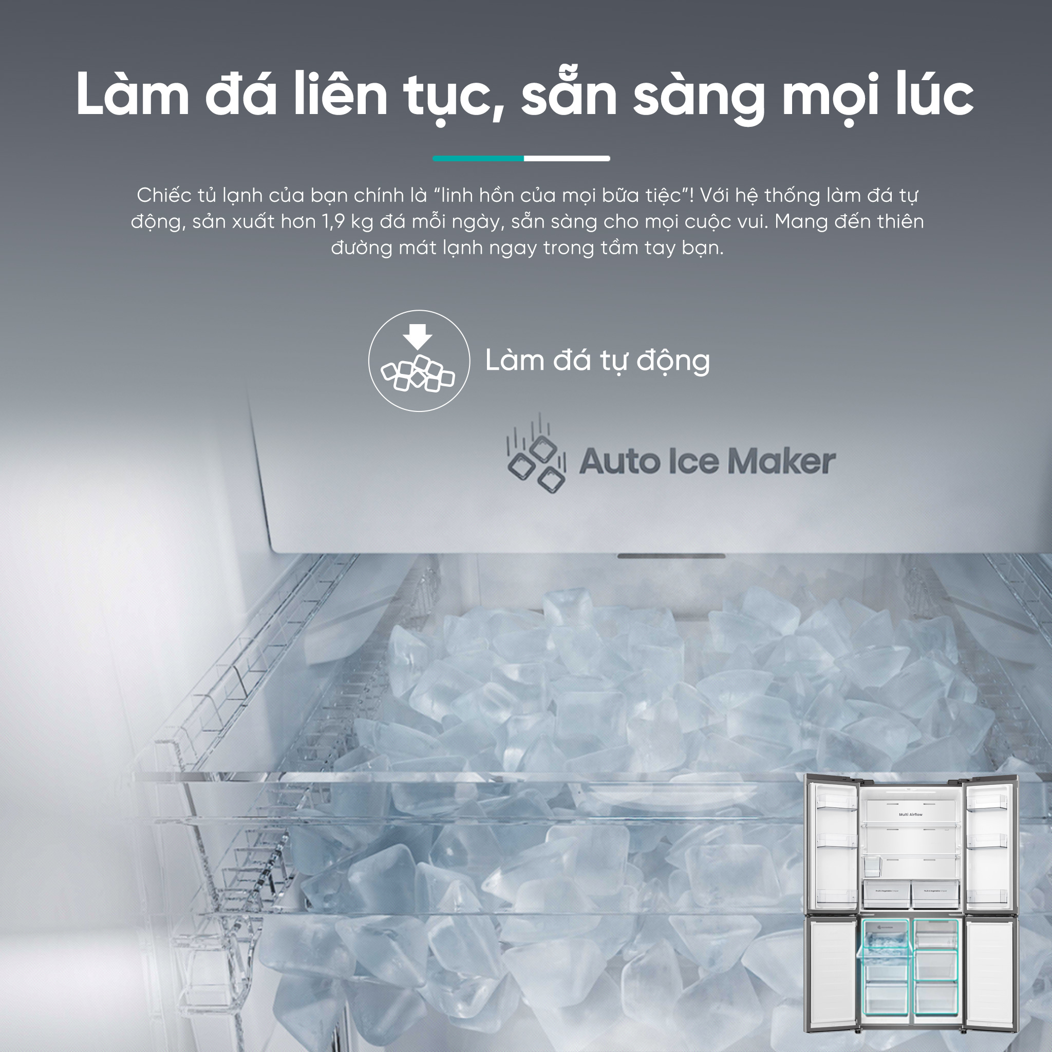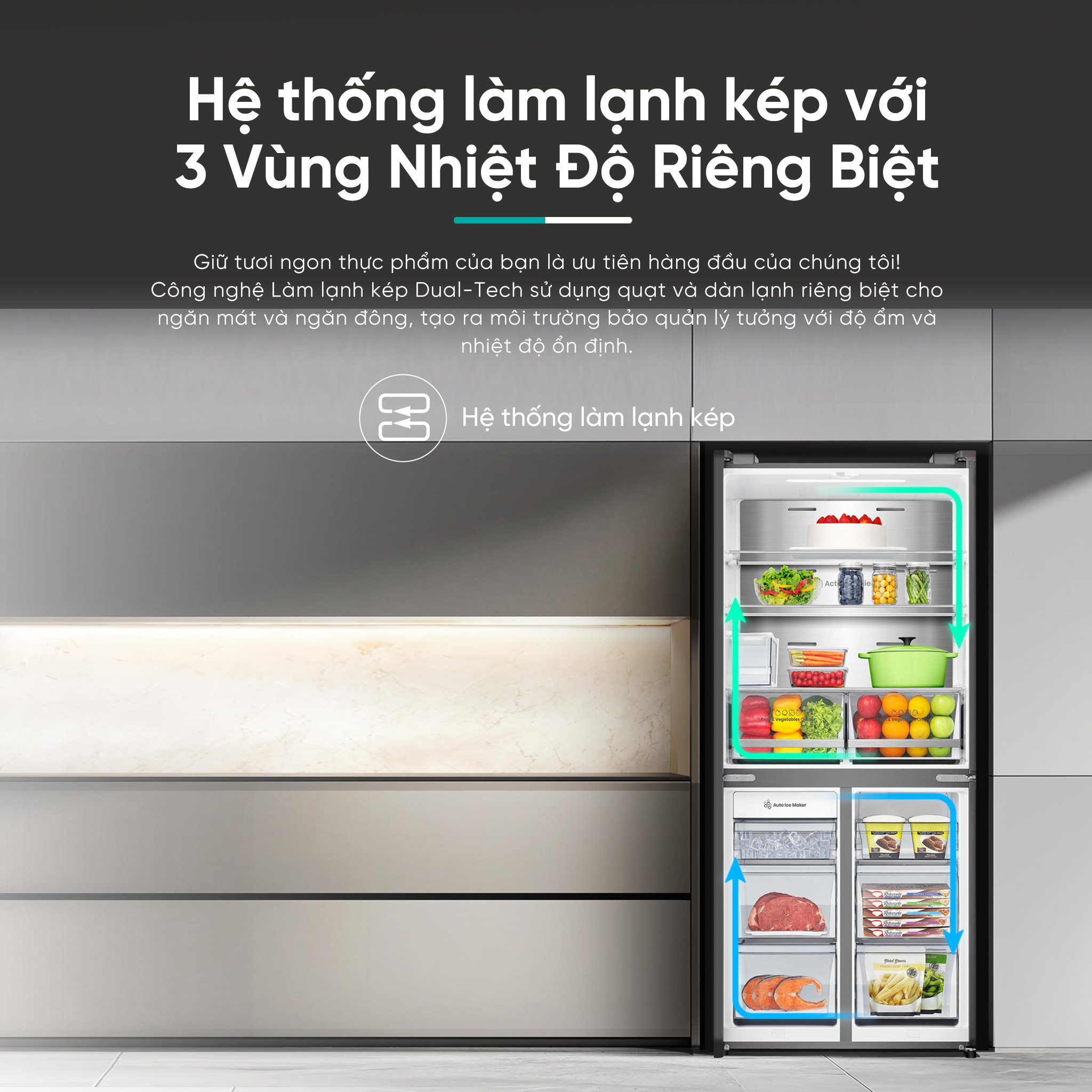 • Làm lạnh đa chiều 360° giúp duy trì nhiệt độ tối ưu trong toàn bộ không gian tủ lạnh